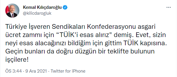 Türkiye İşveren Sendikaları Konfederasyonu’nun asgari ücret zammında TÜİK’i esas alacaklarını söylediklerini belirten Kılıçdaroğlu, “Türkiye İşveren Sendikaları Konfederasyonu asgari ücret zammı için “TÜİK'i esas alırız" demiş. Evet, sizin neyi esas alacağınızı bildiğim için gittim TÜİK kapısına. Geçin bunları da doğru düzgün bir teklifte bulunun işçilere!