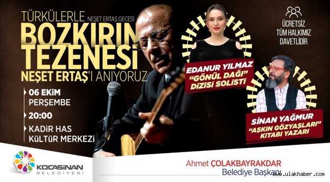 Kocasinan Belediyesi, Bozkırın Tezenesi Neşet Ertaş'ın 10.yıldönümü dolayısıyla anma gecesi düzenleyecek. 'Gönül Dağı' Dizisi solisti Edanur Yılmaz ile 'Aşkın Gözyaşları' kitabı yazarı Sinan Yağmur'un katılacağı programla ilgili açıklama yapan Kocasinan Belediye Başkanı Ahmet Çolakbayrakdar, Kadir Has Kültür Merkezi'nde 6 Ekim Perşembe günü saat 20:00'da düzenlenecek olan 'Türkülerle Neşet Ertaş Gecesi'ne tüm Kayserilileri davet etti.