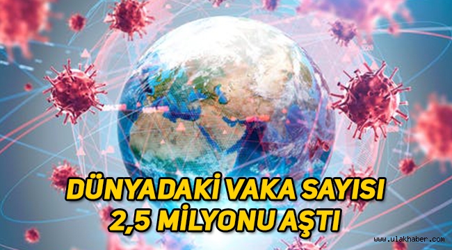 Tüm dünyanın başına bela olan korona virüs salgının vaka sayısı 2,5 milyonu aştı. Yeni tip koronavirüs (Covid-19) görülen ülke ve bölgelerdeki yeni vakalara ilişkin verilerin derlendiği "Worldometer" internet sitesine göre, dünya genelinde toplam vaka sayısı 2 milyon 500 bin 993'e ulaştı.