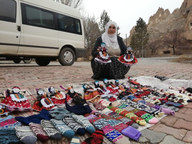 Bu arada, Soğanlı’ya gelen turistler, peri bacaları ve taş kiliseleri gezmenin yanı sıra bölgeye özgü Soğanlı bez bebek ve yün örgü eldivenlere de büyük ilgi gösteriyor.