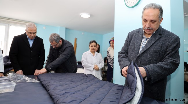 Üretilen uyku tulumlarını inceleyen Başkan Yalçın ve Kaymakam Dönmez, gece soğuğuna dayanıklı tulumlara tam not verdi.