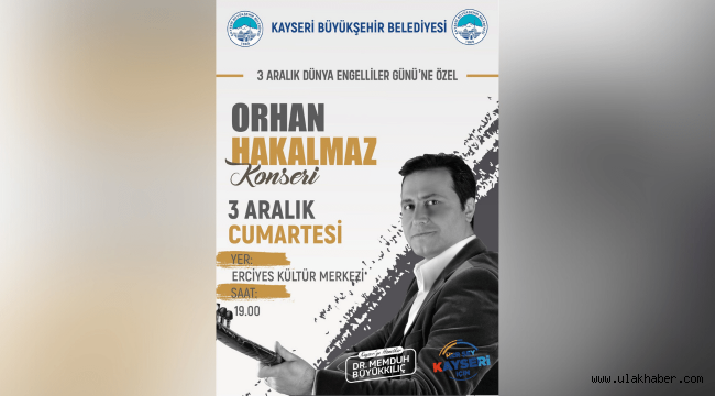 Kayseri Büyükşehir Belediyesi, 3 Aralık Dünya Engelliler Günü’ne özel ‘Orhan Hakalmaz Konseri’ düzenliyor. Büyükşehir Belediye Başkanı Dr. Memduh Büyükkılıç’ın ‘özel kardeşlerim’ diyerek ayrı bir hassasiyet gösterdiği engelli vatandaşlar, Türk Halk Müziği Sanatçısı Orhan Hakalmaz konseriyle özel günlerinin tadını çıkaracak.