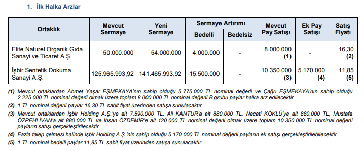 Öte yandan, Elite Naturel’in halka arzında işlem kodunun #ELITE, İşbir Sentetik’in halka arzında işlem kodunun ise #ISSEN olması bekleniyor.